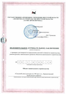 Пройдена экспертиза и получено положительное заключение ГАУИО “ИРЭКСПЕРТИЗА” по объекту: “Сельский дом культуры на 100 мест в п. Лермонтовский Куйтунского района”