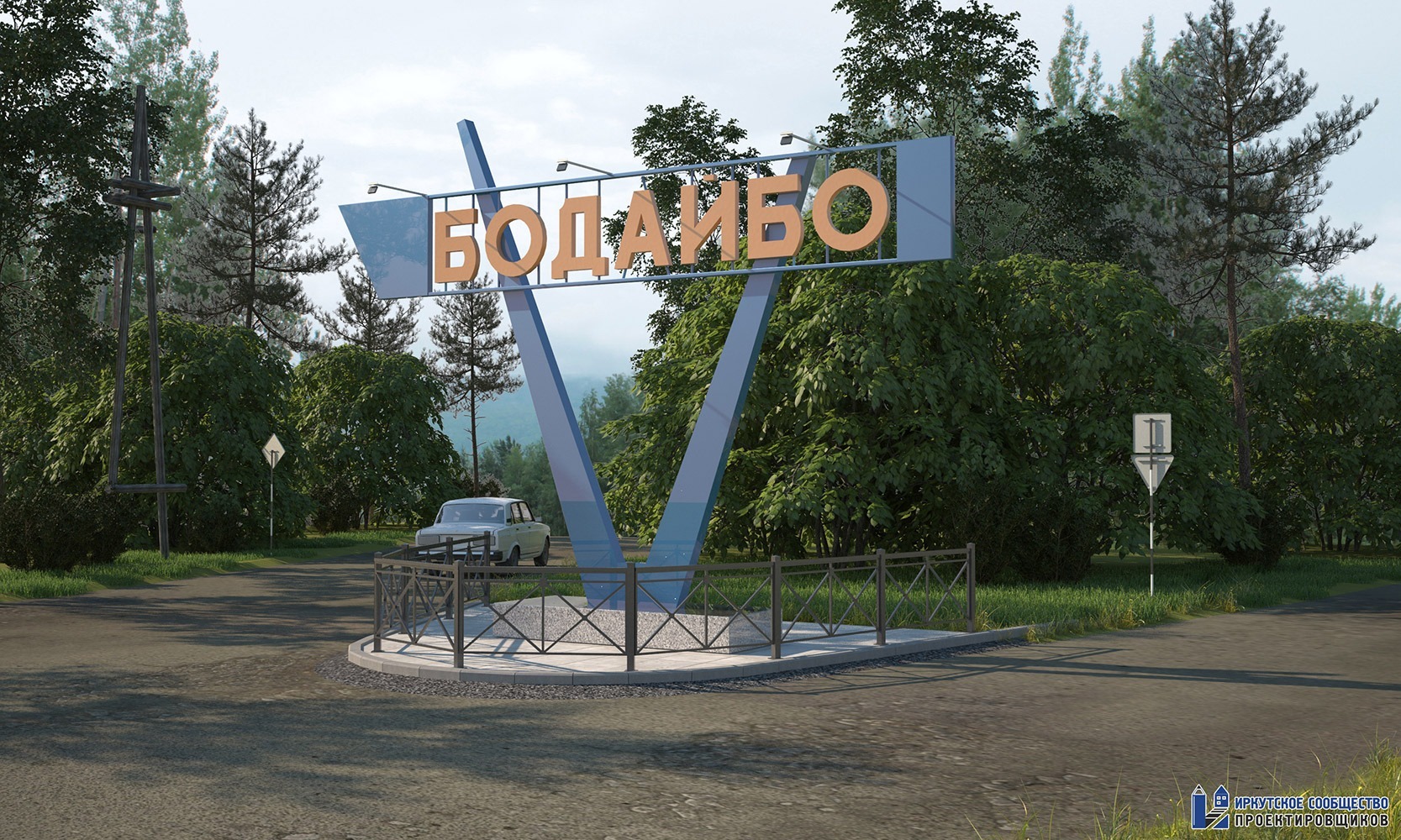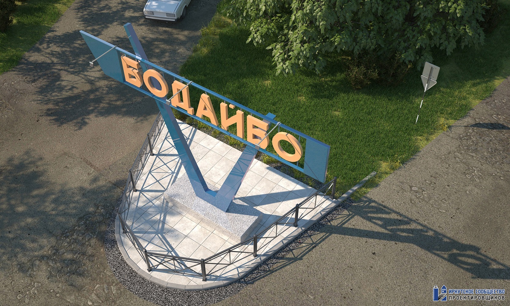 Проектными решениями предусматривается ремонт стелы города Бодайбо, с благоустройством прилегающей территории, устройством ограждения и освещения в месте размещения. Покрытие стелы и букв принято из современного композитного материала, отделка основания выполнена из натурального гранитного камня. Отвод поверхностных вод с проектируемой территории осуществлен в придорожную канаву существующего проезда. Предусмотрена декоративная подсветка композиции.